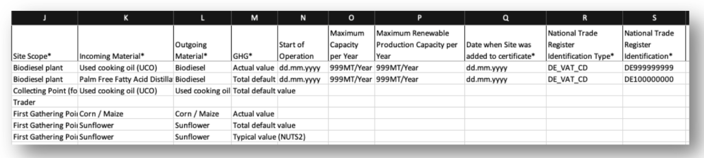 – 您必须在此填写经认证的运营单位的信息,以及必须保持单独质量平衡的证书所涵盖的场所的信息(取决于收集点和外部储存设施)。